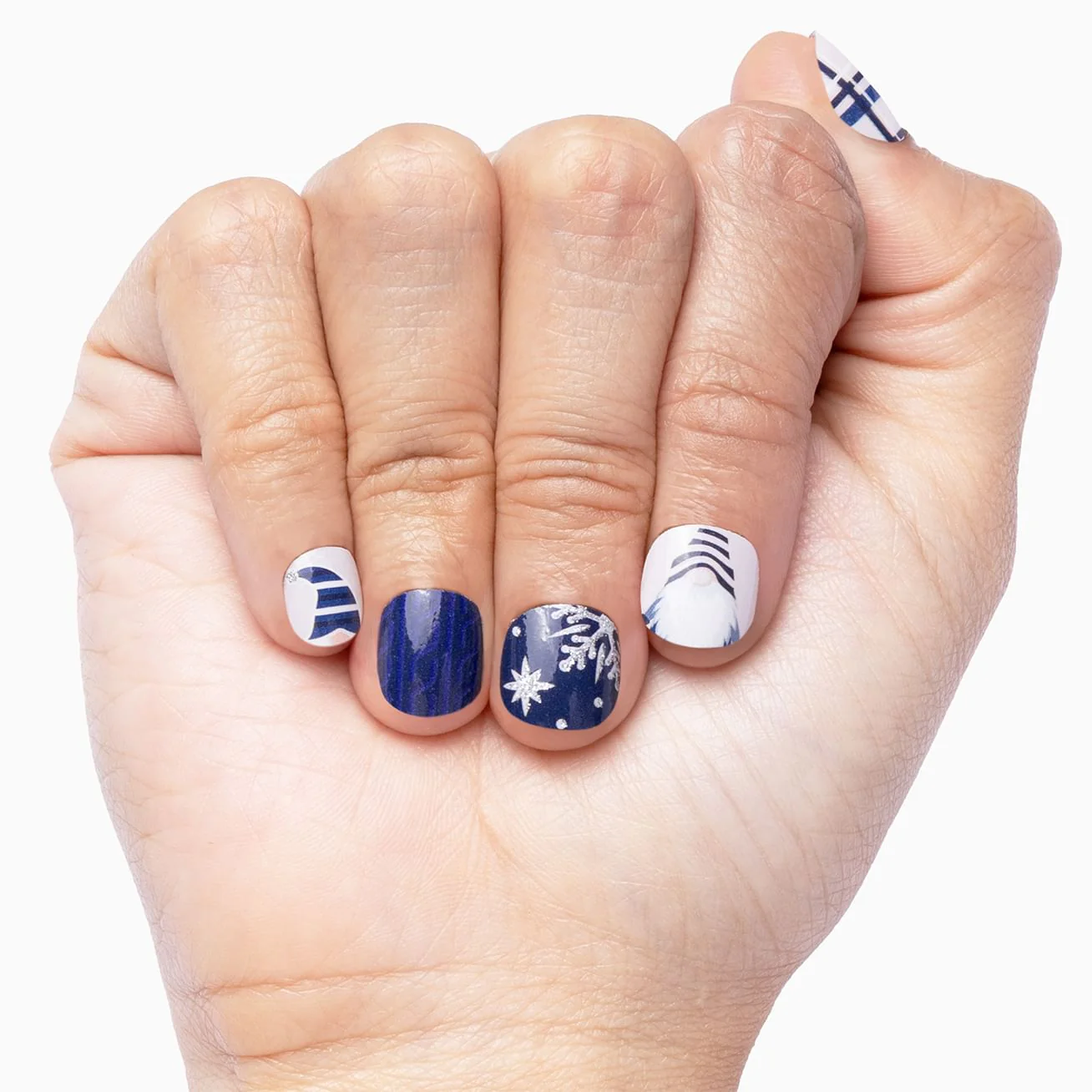 There's no place like Gnome Sweet Gnome! Not even in Nome, Alaska. While these puns are terrible, this nail wrap set is pure whimsical winter fantasy with droll trolls, shimmering snowflakes, preppy plaids, and sweater weather wraps in blue hues, glossy grays, and topped with silver glitter. It should be known that a layer of top coat will keep this manicure in tip-top shape.