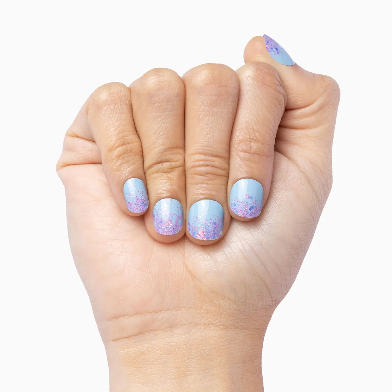 One of our most popular sets, Sea Fairy features pink and blue iridescent glitter against a glossy light blue background. A friendly reminder to all the water-loving mermaids: add a layer of top coat to protect this fantasy mani.
